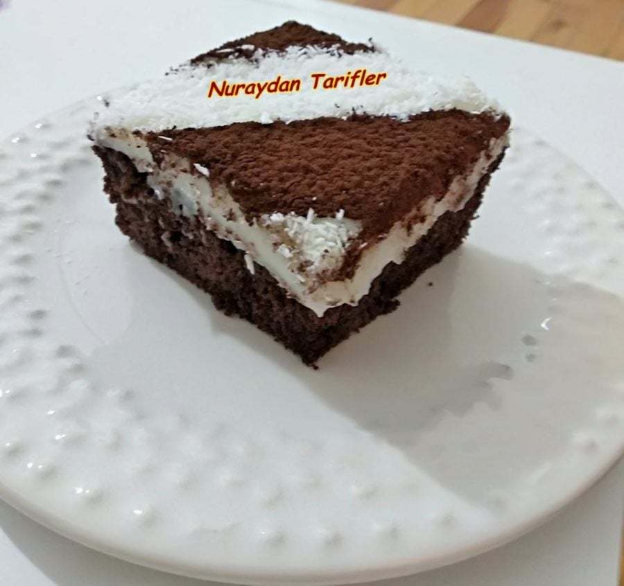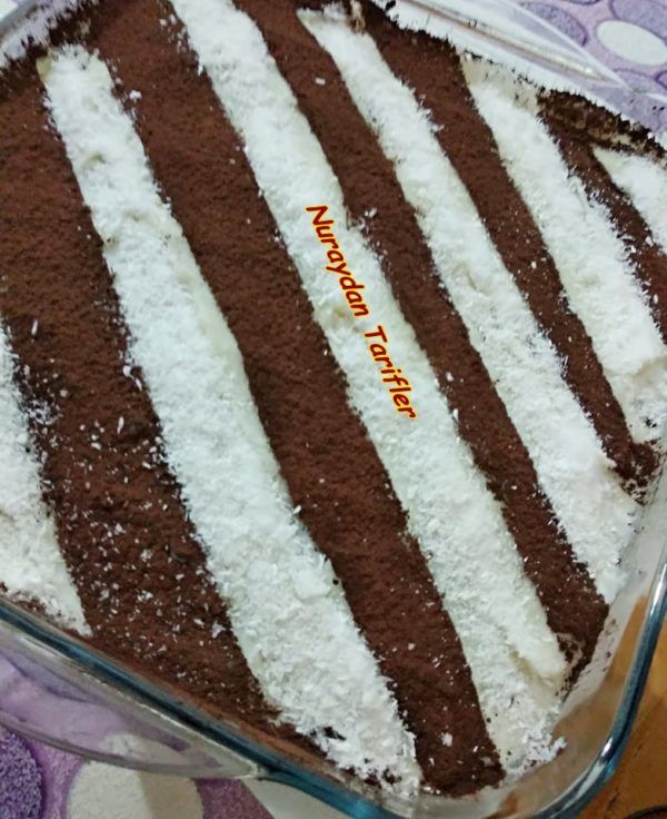 Buzdolabında en az 2-3 saat soğumaya bırakalım.Soğuyunca üzerini kakao ve hindistan cevizi ile süsleyip dilimleyerek servis edelim.