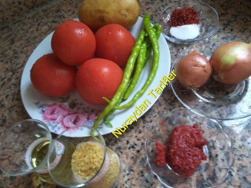 Soğanlar kavrulunca salçayı ekleyip 1-2 dakika daha kavurup ince ince doğradığımız biberleri,kabuklarını soyup küp küp doğradığımız domatesleri ve patatesi ilave edelim.
