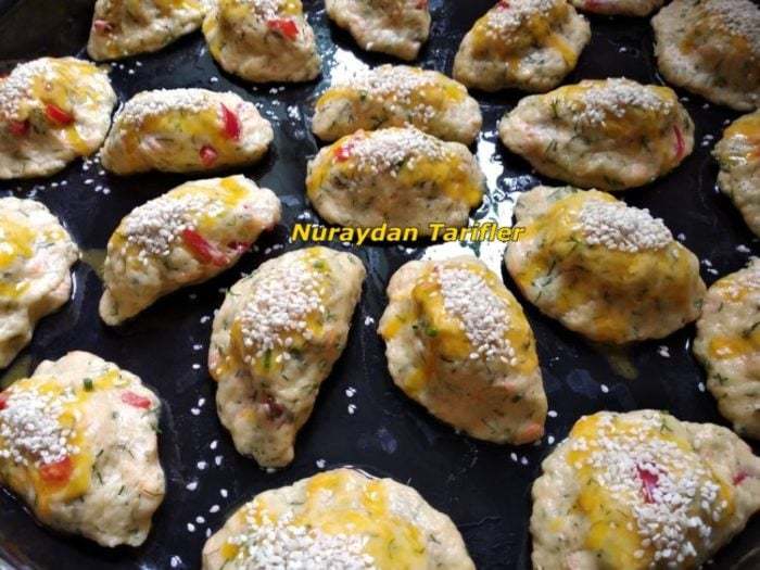 Hamurdan ceviz büyüklüğünde parçalar alıp ortasını açalım beyaz peynir koyup kapatalım şekil verelim.Yağlanmış fırın tepsisine dizelim.Üzerine yumurta sarısı sürüp susam veya çörek otu serpelim.