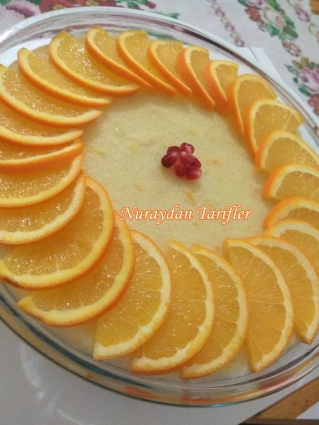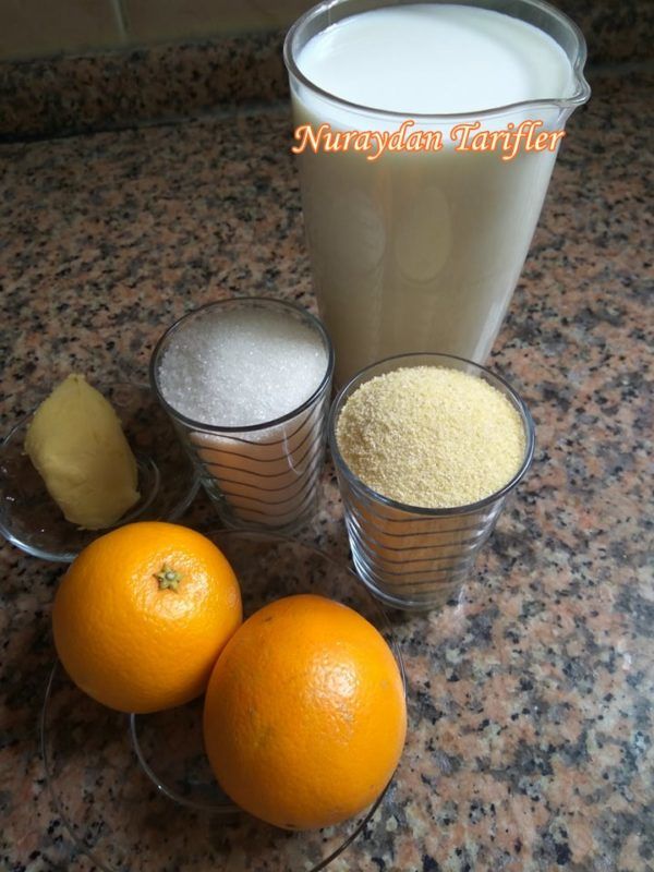 Bir tencere de süt,irmik,portakal suyu,şeker ve tereyağını kaynayana kadar devamlı karıştıralım.Kaynamaya başlayınca karıştırmayı bırakmadan koyulaşana kadar orta ateşte yaklaşık 5-10 dakika pişirip ocaktan alalım.